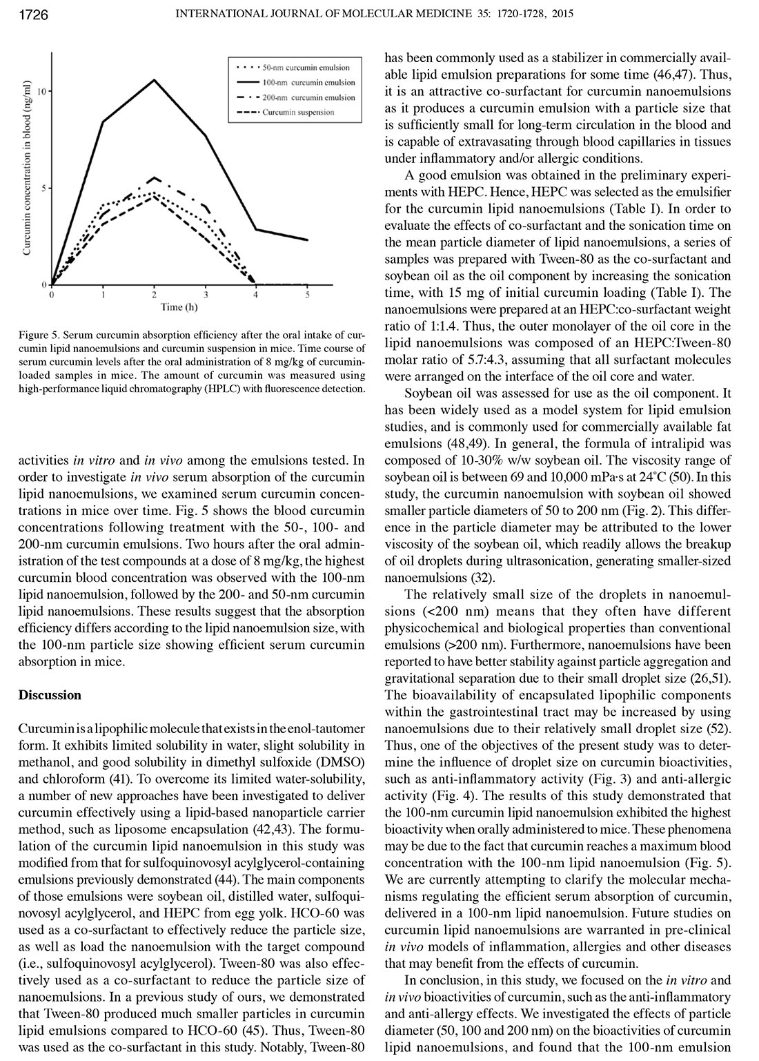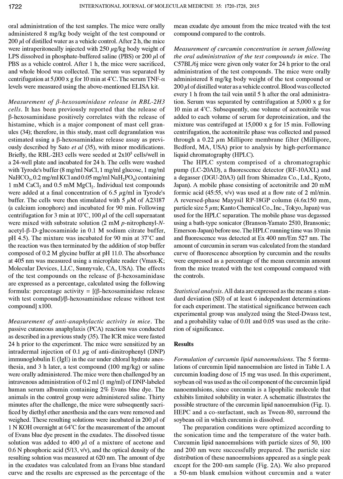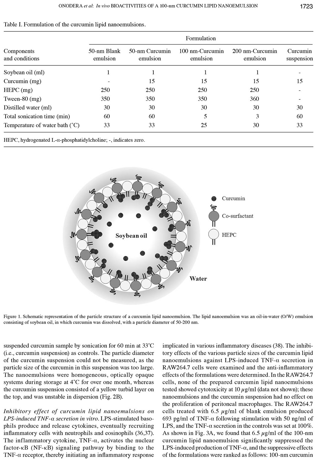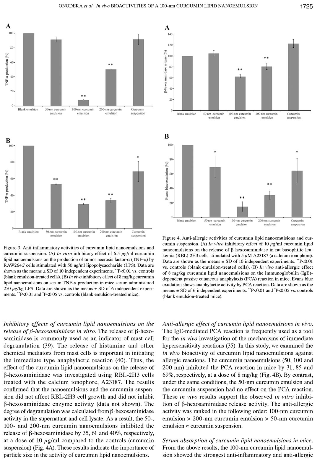 Influence of particle size on the in vitro and in vivo anti-inflammatory and anti-allergic activities of a curcumin lipid nanoemulsion
