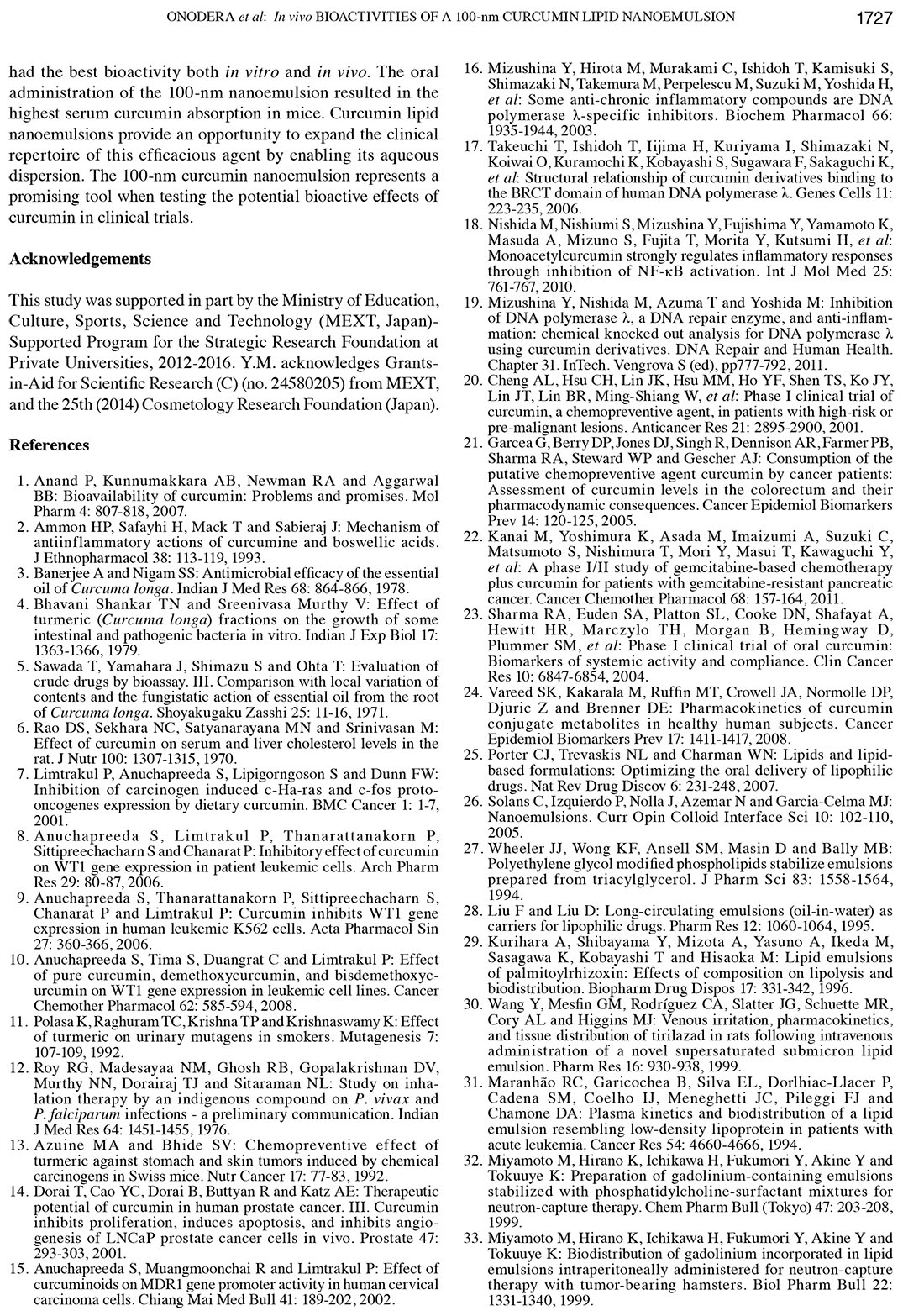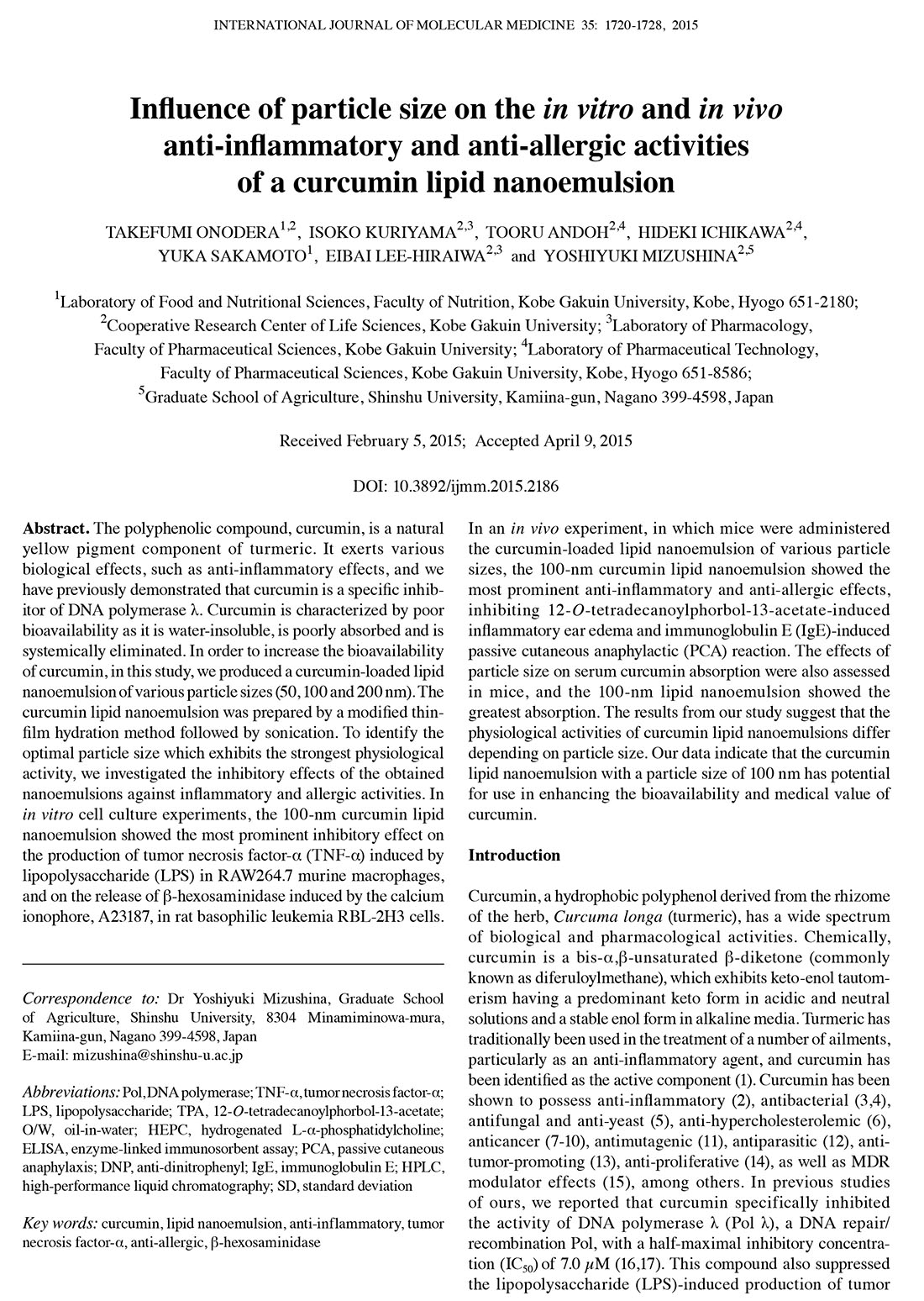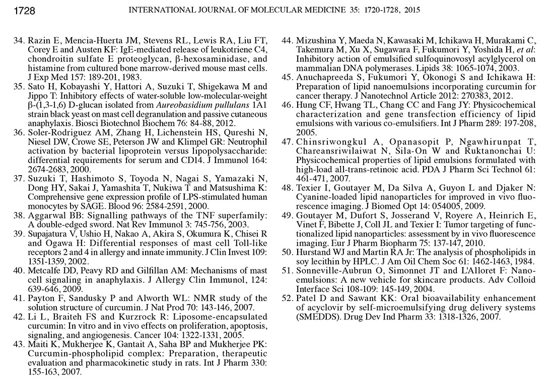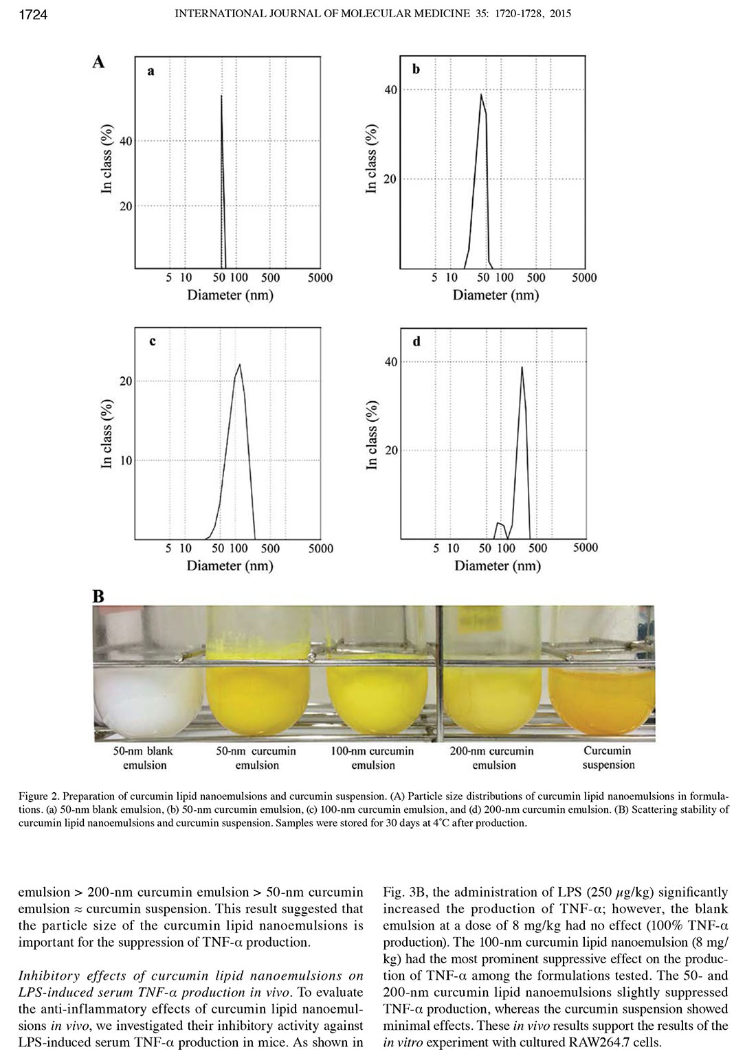 Influence of particle size on the in vitro and in vivo anti-inflammatory and anti-allergic activities of a curcumin lipid nanoemulsion