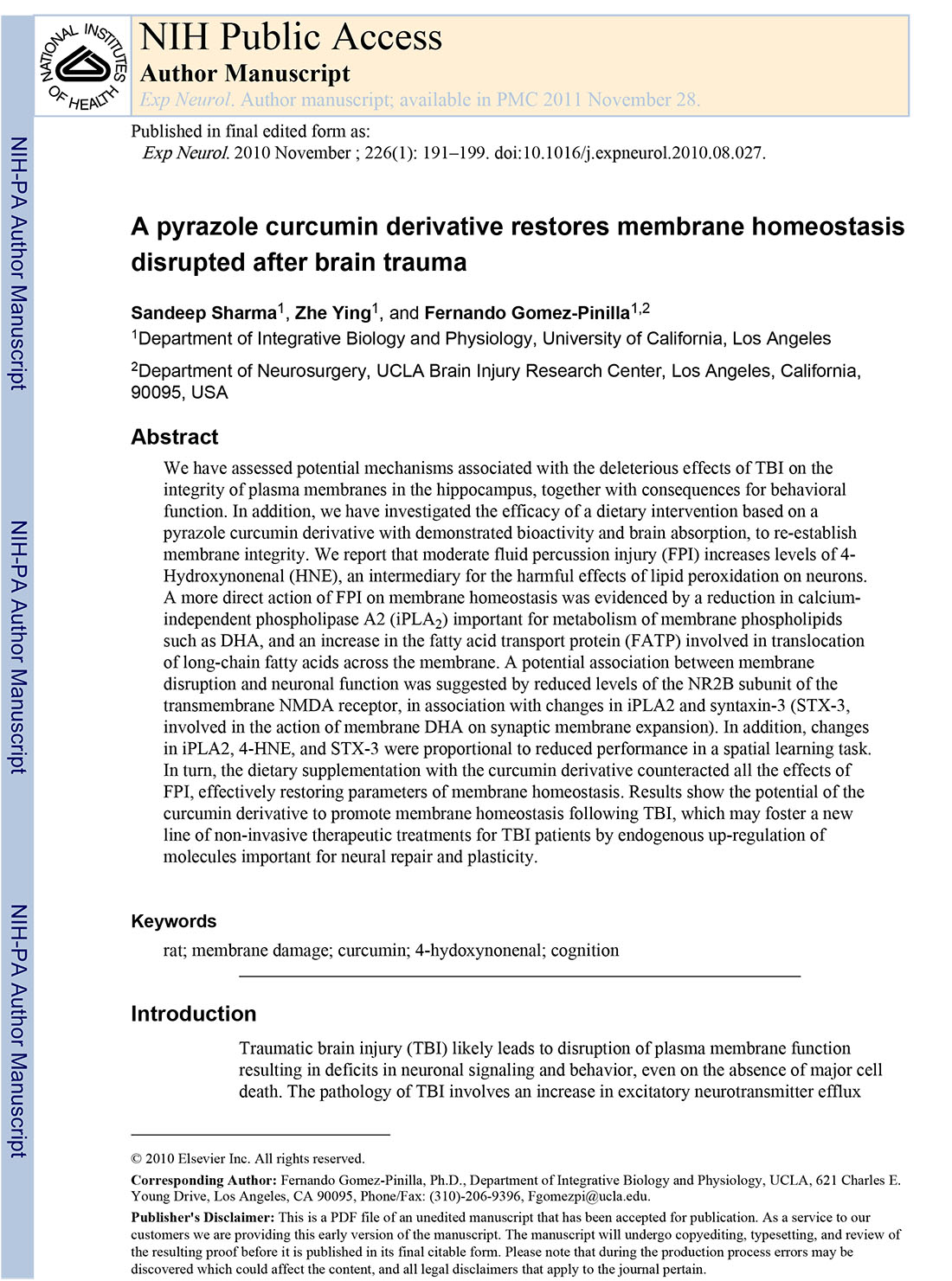 A pyrazole curcumin derivative restores membrane homeostasis disrupted after brain trauma