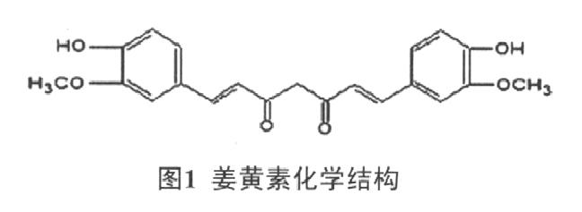藥姜黃具有破血行氣、通經(jīng)止痛之功效,有效成分為姜黃素(curcumin)、脫甲氧基姜黃素及雙脫甲氧基姜黃素,姜黃素是其中主要有效成分[1]。姜黃素曾作為香料和食物色素廣泛用于食品工業(yè)[2],其結(jié)構(gòu)式見圖1。近年,姜黃素的藥理活性不斷發(fā)現(xiàn),如抗炎、清除自由基及抗癌等[3],其中一些藥理作用已進入臨床驗證階段。現(xiàn)將近年國內(nèi)外有關(guān)姜黃素的臨床研究成果作一綜述,以期為姜黃素的應(yīng)用與開發(fā)研究提供參考。